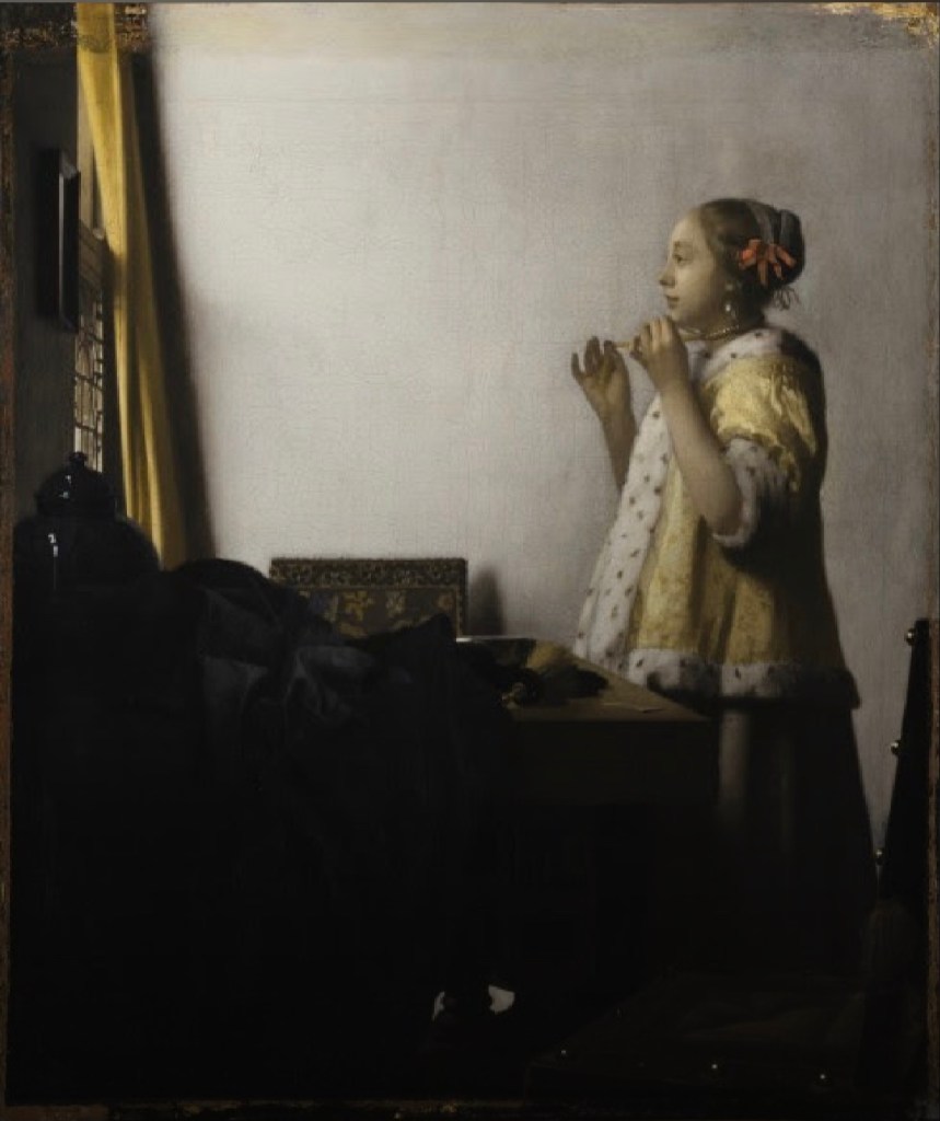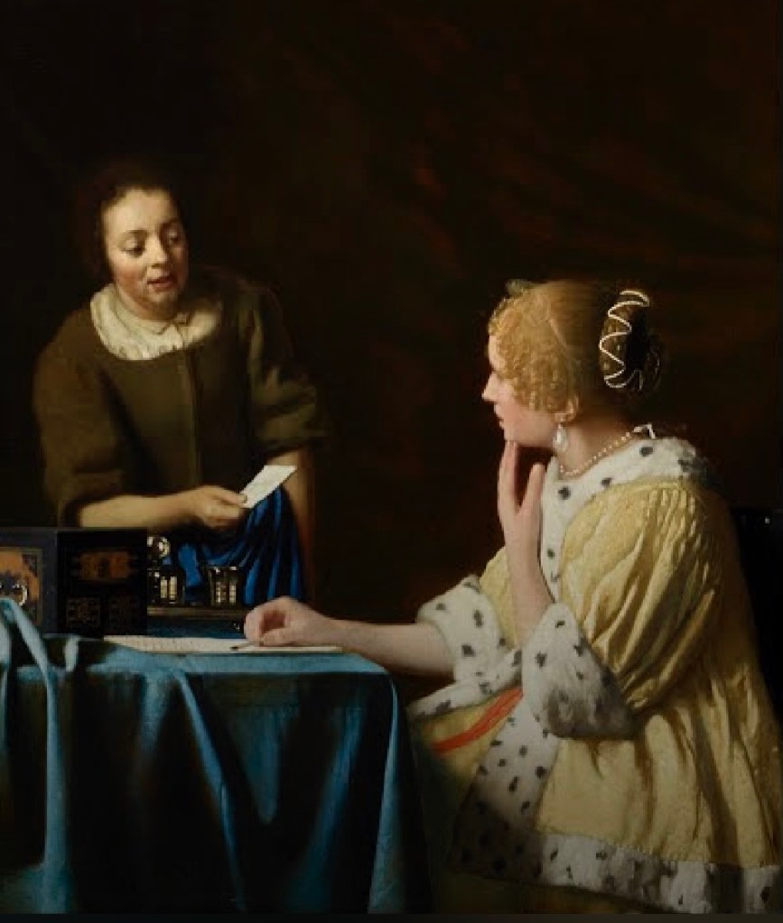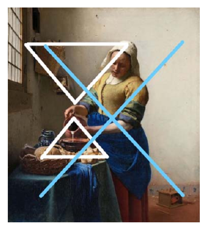 The regular triangle, inverted triangle and "X" shape composition, the entire picture forms a rigorous and harmonious balance. The composition and layout of the entire painting has been arranged by Vermeer: ​​the lights next to the window and the bamboo and rattan basket are placed in the blank space in the upper left corner of the picture, which contrasts with the blank space on the right side of the figure. At the same time, a white headscarf and a white wall echo, a yellow top and tan bread are reflected, and a dark green tablecloth contrasts with a dark blue apron. The picture runs from left to right, from top