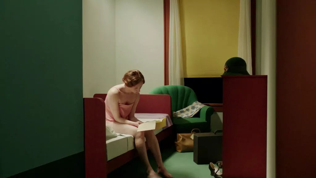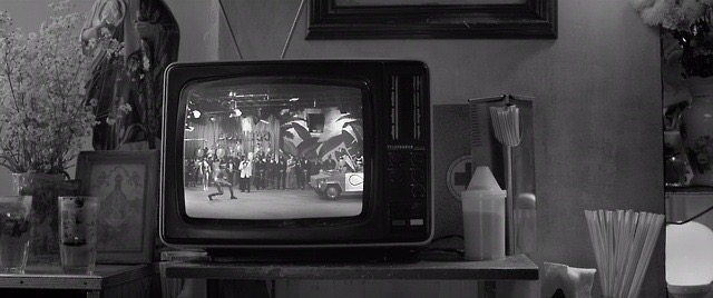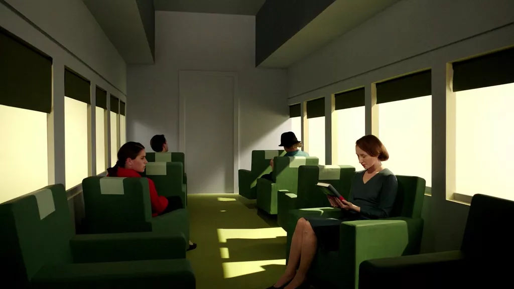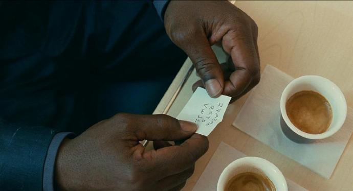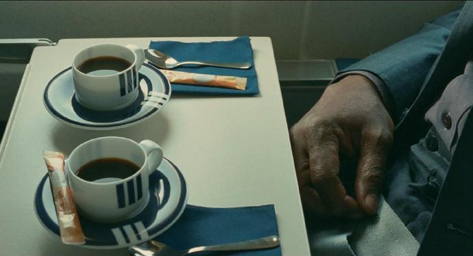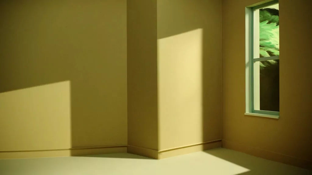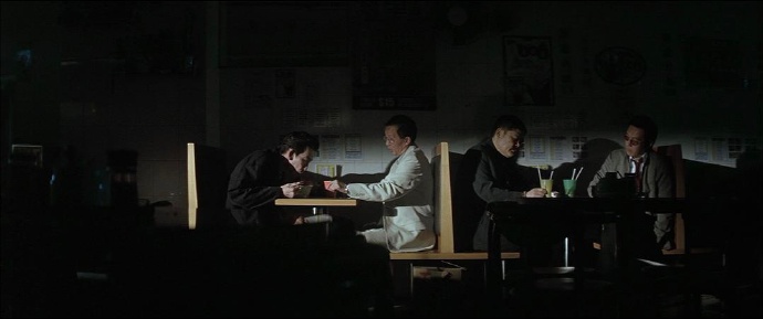 The brightness of the table and the background wall behind the character changes significantly, just right to show the perspective relationship, beyond the restaurant we see the light and street shape at a sharp angle, the light and shadow form the perspective of the restaurant.