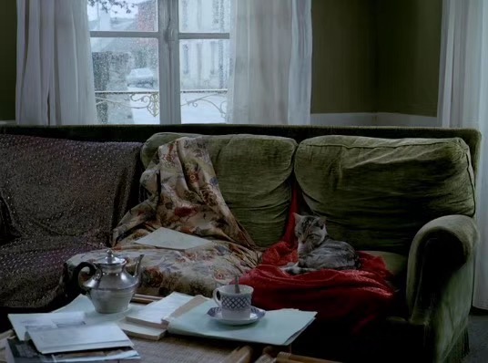 If I composite I want to let the wife sit on the ground and depend on the sofa, her arm on the sofa’s handle . Making the lamp like the only light resource. Cold moonlight on her hair and body(back and one side) warm lamp light only on her face and wine bottle.